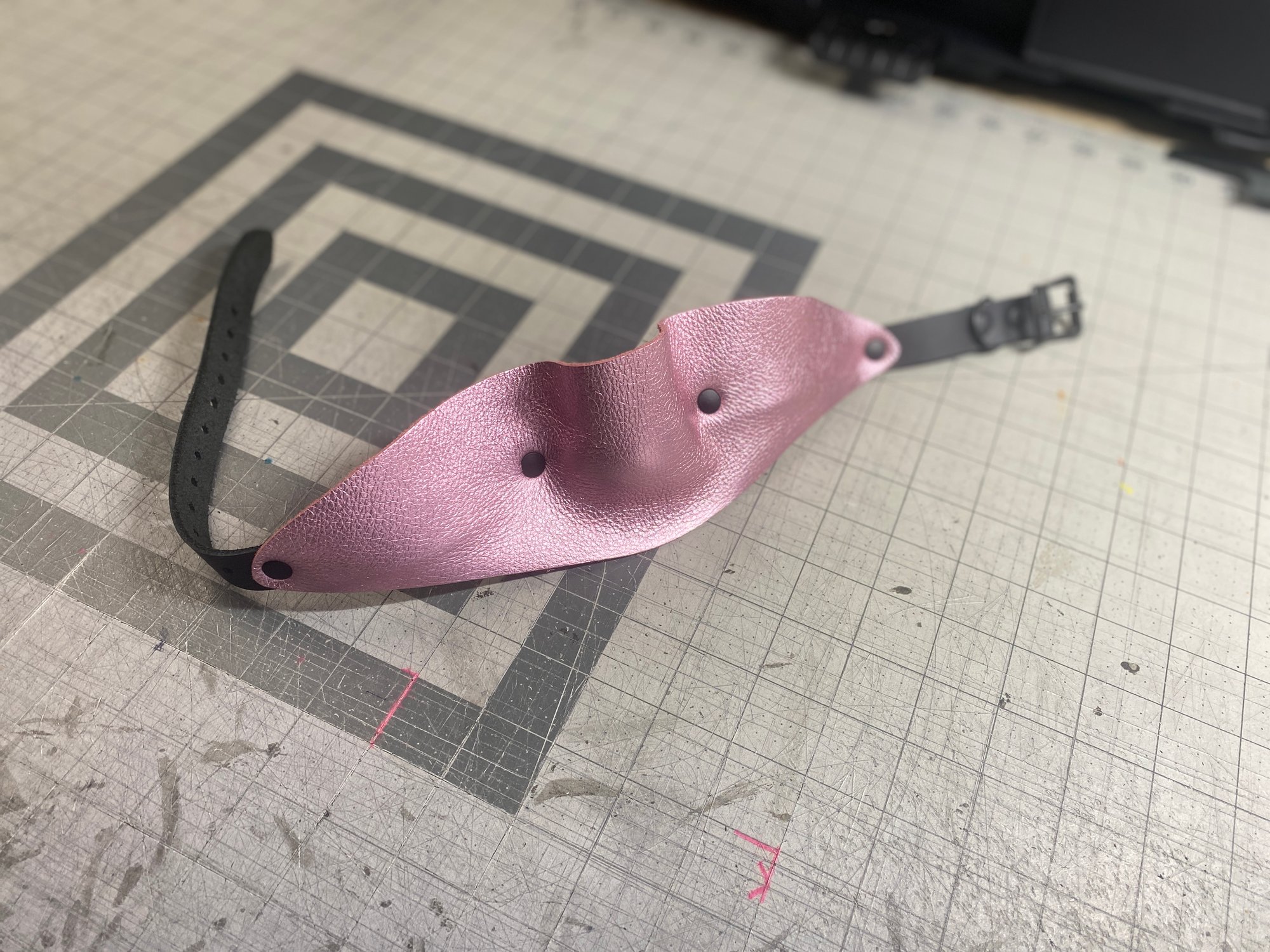This listing is for a single strap panel gag using a pink metallic pebble look leather. I saw this color and wanted to try it out. I used black hardware with a standard buckle and a 2 inch pink silicone ball.